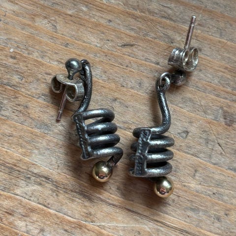Et par sølv øredobber, sannsynligvis fra 70 - tallet, selges for 350 kr. - Tydelig merket. Jeg mener stemplet er fra Finn Jensen. Full lengde ca 5 cm.