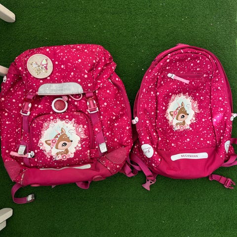 Beckmann skolesekk 1-4 kl. Sekken har sidelommer og magebelte og er god å ha på seg. Selges med tilhørende gymbag. (Gymbagen kan festes fast i skolesekken). Pent brukt! Nypris 799,- +349,- Selges helst samlet