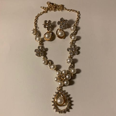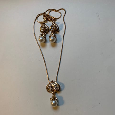 Smykkesett perlekjede og øredobber selges kr 200:-.