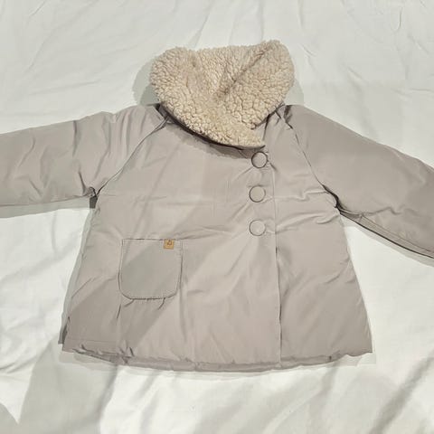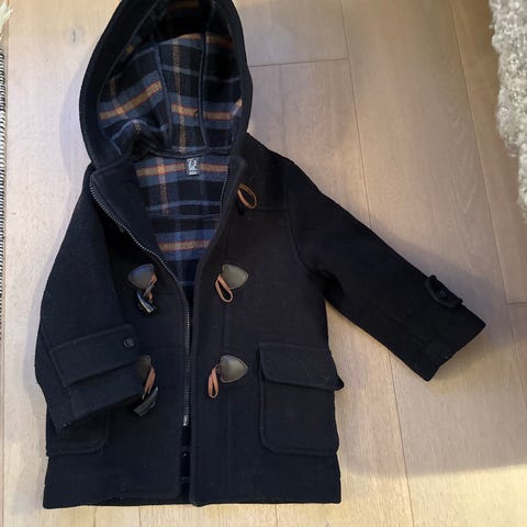 Pent brukt duffelcoat fra Zara, mørk brun, fin til gutt og jente. Str 9-12 mnd.