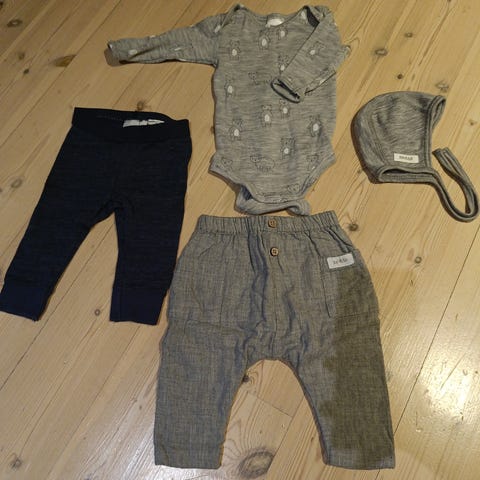 Grått, ribbestrikket ullsett fra Joha, bestående av jakke og bukse, str. 80. Nypris var 899 kr.