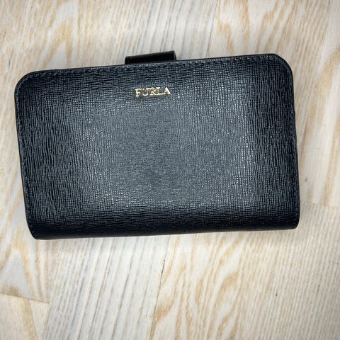 Lekker Furla lommebok i blått og brunt skinn. Avtagbar reim.