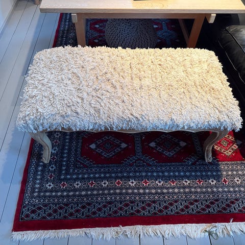 Den er håndlaget, med mønster. Høyde 37cm, lengde 50cm & 22cm bred.