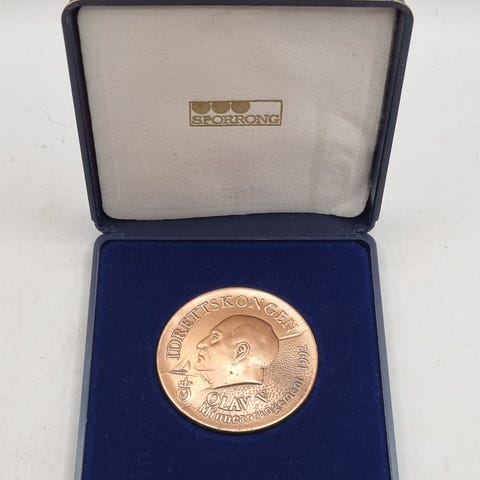 Minnearrangement 1992 over Idrettskongen Kong Olav V i bronse. Diameter 45mm og ca 52g tung