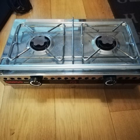 Parker er et frittstående emaljert kokeapparat med 2 bluss for plassering på benk.