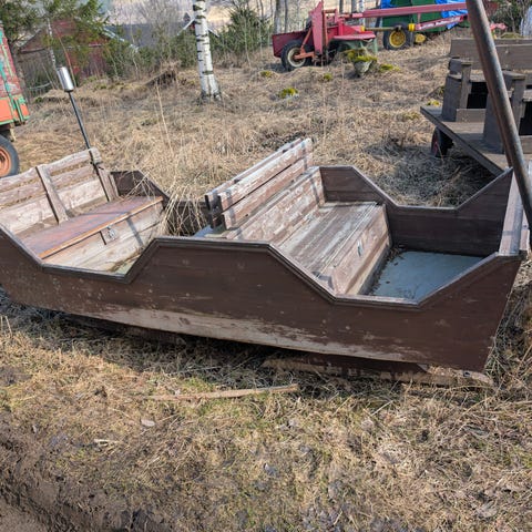 Fin hesteslede i god stand. Med skjæker. Løse karmer og sete. Stål på meiene. Meget solid materiale i sleden.Lengde ca 230, bredde 80. Sleden antatt fra ca år 1950. Passer en mindre hest.
