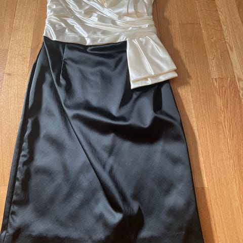 Partykjole som ble brukt 2-3 ganger. Str. M. Svart og hvit farge. Lagd av Silkestoff og satinsilk. Glidelås på siden .