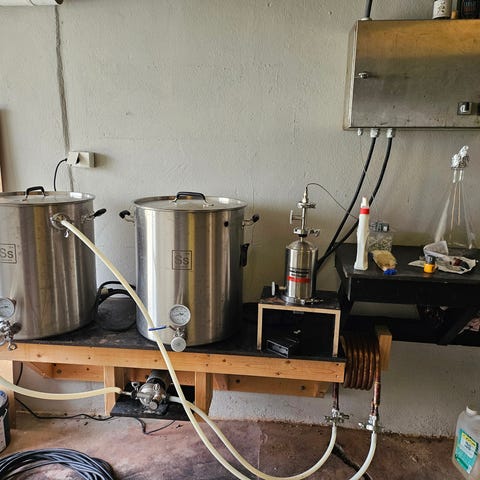 1 stk motstrømskjøler i kobber samt diverse slanger/koblinger, timere/termostater, bøtter medfølger