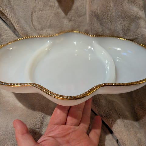 Selger ubrukt serveringsfat fra Fire king. Melkehvit relishdish med 22 k gullkant. L 28 cm B 20 cm.