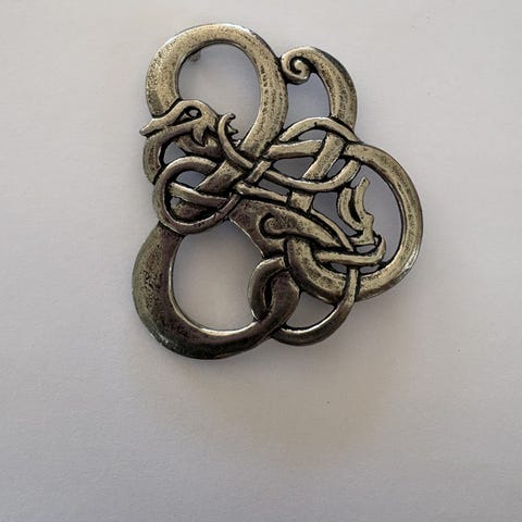 Jeg skrev opprinnelig: "Denne er et mysterium. Jeg aner ikke hvem som har laget den eller hva slags metall det er. Jeg tipper på tinn, men er ikke sikker. Jeg antar at den opprinnelig var tenkt som en brosje eller et anheng, men ikke noe på baksiden kan bekrefte dette. Slik den er nå, kan den fint brukes som et anheng med et grovt kjede eller lær-reim. Jeg selger den for 100 kr."