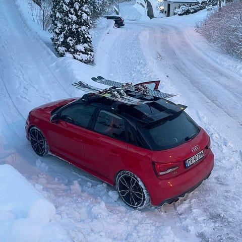 De fleste biler kan bruke dette skistativet, og det er meget kompakt når det skal oppbevares. Som avbildet passer det meget bra på BMW i3 - Tesla Model S og Porsche 911.