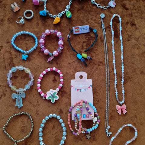 Diverse øredobber, ringer, armbånd og en liten søt elefant maskot selges.