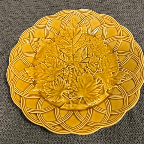 Kurvfletting og bladmønster i relieff, lys honninggul glasur