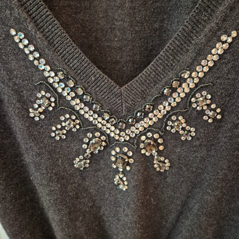 Kvalitet. Brun Cardigan og topp fra Guess. Str. S. Lengde Topp : 83 cm. 94% wool, 6% cashmere. Ny kr.2.400,-. Kun prøvd. Glemt bort. Som ny. Selger kr. 850,-.