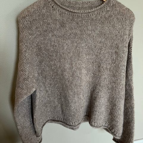 Det var litt vanskelig med mål på denne pga mye legg i front og stoffet “lever“. Lengde-målet er kun stoffet. Pga knyttingen er regulerbar rundt hals/nakke, kan lengden variere avhengig av hvor løst eller stramt du vil ha det, den blir altså litt lengre enn stoffmålene under.