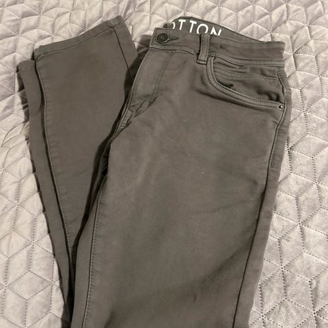 Skinny fit. Str 152. Kun brukt 1 gang. Fremstår som ny. Kjøpt på H&M, selges for halvpris av nypris. Lysegrå i fargen. Kommer fra et røykfritt hjem.