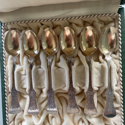 Teskjeer med vridd skaft. Alle er preget med THV 830S. Fra 1913 eller tidligere. Gravert med 10.5.13. Lengde 13 cm. Jeg tyder ikke gravering på 2 bokstaver i front. Original gammel eske. Stoff preget i gull med :THV Jørgensen Gullsmed Hønefoss. Nydelige teskjeer som ser ut som nye. Samlet pris.