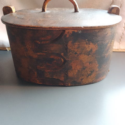 Bollen er 1200 gram, diameter 23 cm. Den har tre føtter, to av dem er "loddet" på i ettertid, det vises. Den er tydeligvis velbrukt, den har en del skrapemerker. Patina, kaller antikvitetshandlere det:-)