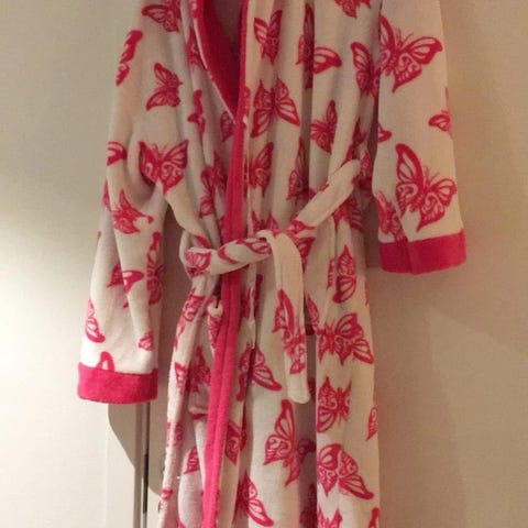 Lekker morgenkåpe i hvit med teksten "Bath Tub Club" på ryggen i sort. Kåpen er helt ny med lapper, og er størrelse 38. Materiale: 100% polyester. Jeg sender stort sett alltid første virkedag etter mottatt penger for frakt :)