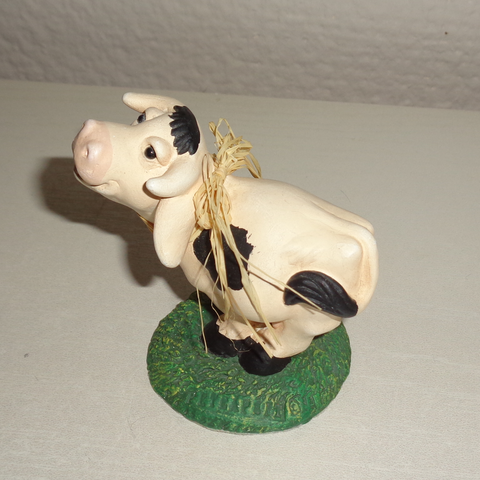 Pyntegjenstand sau selges. Avtagbart hode, dingler frem og tilbake når det er i holderen slik at den ser levende ut. Høyde: ca 12 cm, bredde: 18 cm. Keramikk og knuselig.