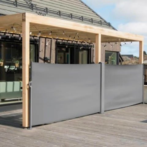 Terrassemarkisen er laget av kraftig polyester, noe som gjør den vann- og smussavstøtende, samt UV- og værbestandig. Den sterke pulverlakkerte stålrammen gjør hagemarkisen solid og holdbar. Takket være det sammenleggbare designet kan denne hageskjermen enkelt brettes sammen når den ikke er i bruk for å spare plass. Og med veggbraketten kan denne vindskjermen for terrasse lett monteres på veggen.