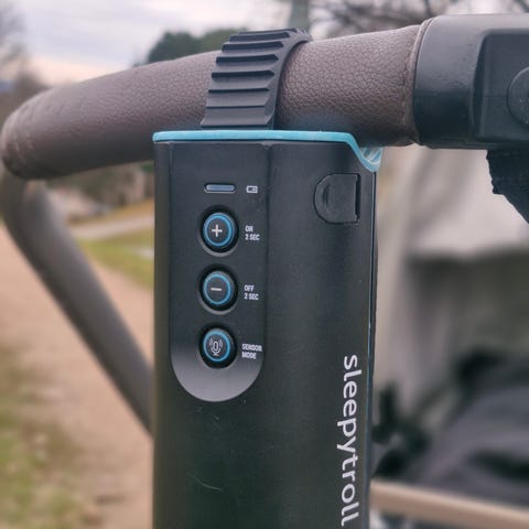 Sleepytroll har innebygd lyd- og bevegelsessensorer som forsiktig starter å vugge barnevognen når lyd eller bevegelser blir registrert.