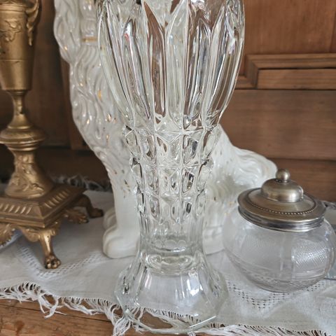 Gammel vase i glass med fin dekor. Høyde 16 cm.
