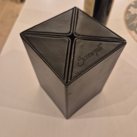 Morsom og praktisk holder for skjenking fra flaske selges. Den er i ganske tykt lær som er dekorert på sidene og merket "MADEIRA". Holderen åpnes enkelt med en vrider i enden for innsetting av flaske. Holderen har en total lengde på ca 27 cm, høyden er ca 17 cm.