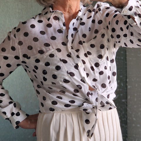 En nydelig og lett hvit skjorte med prikker, uten ermer. Litt lenger bak enn foran.