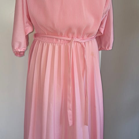 Nydelig, fotsid, kjole med strikk i livet og applikasjoner i brystet. Fin dus- lilla farve!