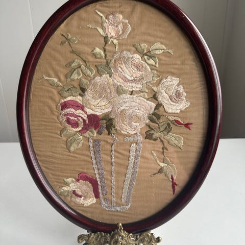 Antik broderi i needlepoint, petit point og perlebroder av en mor som spinner på den gammeldagse måten mens barnet ser på. Ansiktene, armene og hår er sydd i petitpoint, mens klærne, trærne, den lille broen og vannet i bakgrunnen og gresset og stenene foran er sydd i needlepoint (litt større sting). Espalieret (gitterverk) og blomstene i forgrunnen og bakgrunnen samt alle bladene er brodert med perler i sterke farger. Garnet som mor spinner og hårsløyfen på barnet er i metallisk gul perler. Broderiet er limt på en treplate og er fortsatt i den originale rammen i bjerk og svartmalt tre. Hele bildet måler 40,5 x 40,5 cm. Selve broderiet måler 32,7 x 31,7 cm. På baksiden er det en inskripsjon: