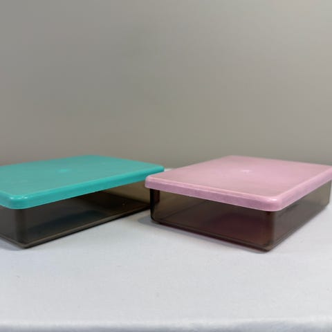 To firkantete bokser:11 x 9,5 cm. Liten sprekk i lokket.