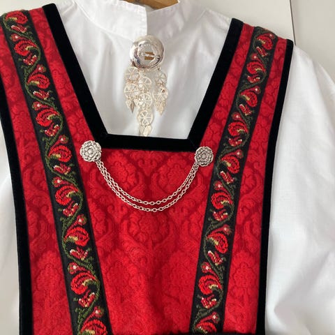 Denne bunaden er perfekt brodert. Den passer nå str 36, høyde 165-168. Den kan sys ut ca tre str, og ned ca 20 cm. Den koster 25000 med kun såsydd sølv(spenne, maljer og lås), eller 30000 med alt av sølv som hører til. Sølvet er gravert fra Vossasylv, låsen er i sølvplett. Nuperelleskjorte i lin eller bomull medfølger(uten broderi), og stakken er i ulldrape fra Gudbrandsdalen uldvare. Tråden er fra Rauma garn, og vesten er fra Berhnard L, Frogner. Livstidsgaranti på kvaliteten på ullen og tråden/sømarbeidet. Se flere bilder emblabunader Instagram eller Facebook.