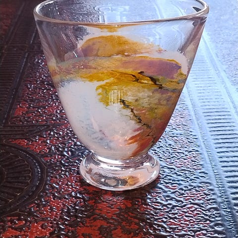Den er laget med "bullicante"-teknikken, som innebærer å innføre kontrollerte luftbobler i glasset for å skape et dekorativt mønster.
