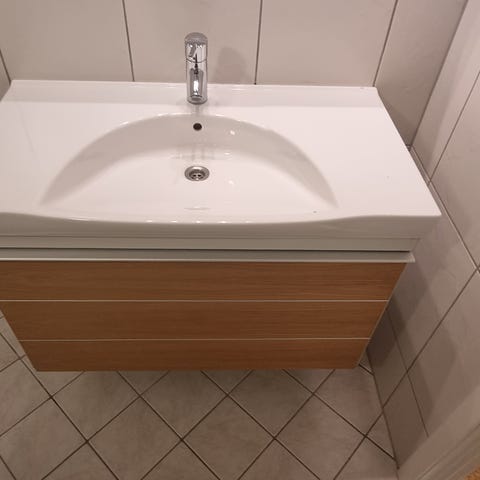 Øveste skuff i baderomsinnredning er ferdig levert skjært ut i midten slik at det er plass til vvs. Det følger det med et plastinnlegg for øvereste skuff slik at ting kan sorteres.