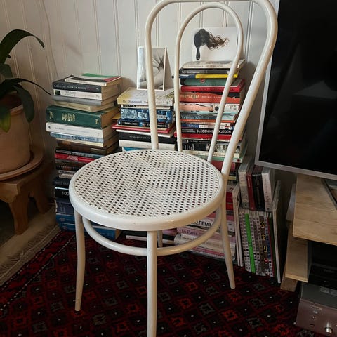 Flott spisestol i burgunder (plommefarget) ullstoff og treverk i heltre oljet eik. Passer fint som avlastningsstol, f.eks. i entreen, på et soverom eller gjesterom. Framstår som helt ny, uten noen form for slitasje, falming eller flekker. Ikke røyk og dyr. Svært god sittekomfort.