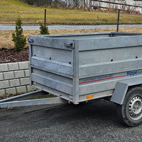 Tilhenger leies ut. Kr.250 per påbegynt døgn. Regntrekk følger med dersom det er ønskelig. Sidene (øverste halvparten) kan enkelt taes av.