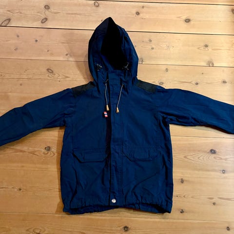 Fin og god jakke i mørk blå. Mykt bomullsfor. Strikk på armene. Knapt brukt. Ser det er en liten rift på ryggen, men har aldri sett den før så veldig liten. Se bilde.