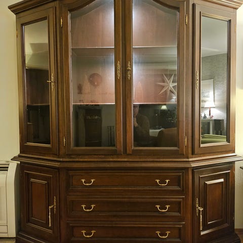 Vitrineskap med trehyller, solid og tungt, kan ikke demonteres