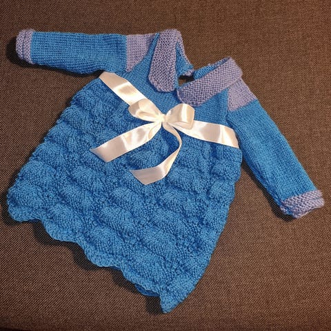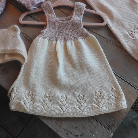 Hjemmestrikket kjole med tilhørende sokker og hårbånd i fargen off white og grønn