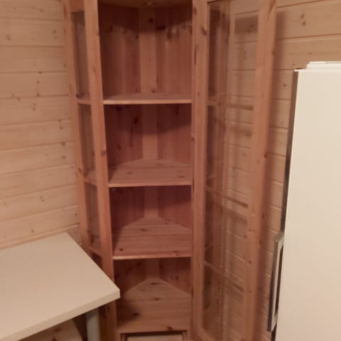 Solid hjørneskap på vegg, blir flott med ny maling. Høyde 87cm dybde 44cm bredde 82cm.