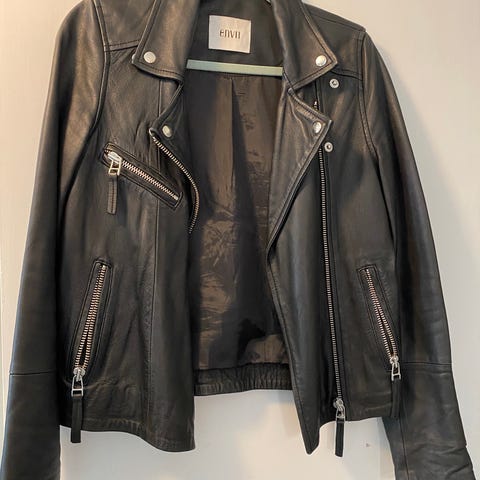 Selger gråblå «skinn» jakke, meget pent brukt, ingen slitasje.