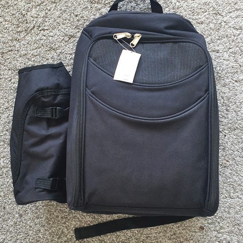 Tursekk med fat, kopper, servietter og bestikk. Brukt 1 gang! Det meste oppi aldri brukt! Ekstra lommer på sidene. Selges Kr 200,-
