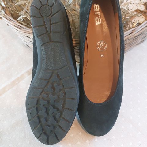 Pent brukt ballerinasko i semsket skinn med pen blomst i samme skinn foran. Farge mørkeblå, str 37. Meget mykt såle.