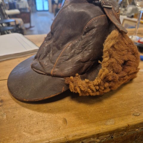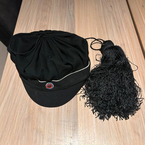 Båtlue for barn med speedway-merke. 26 cm lang (52), 1960-tallet.