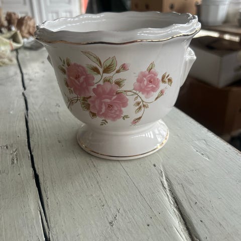 Nydelig mellomstor blomsterpotte med skjønne roser som dekor rundt hele potten. Slitt gullkant øverst og nederst på stetten.