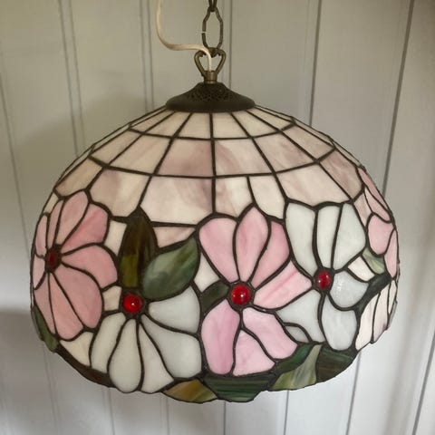 Stilig lampe fra Nostalgia Design, produsert som en Tiffany, med håndskåret glass. Noen små sprekker, knapt synlige. Ekstra lengde opphengslenke medfølger.