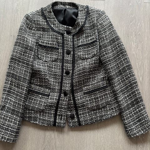 Selger en kort sort/hvit jakke. Den har detaljer i kunstskinn. Kun brukt 1 gang da den er litt stor til meg. Veldig fin i stoffet.