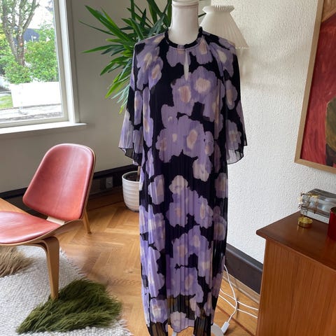 Pen blå kjole som kan dras ned på skuldrene. Lommer i sidene og pen linningen. Kjolen går under kneet. Ikke vært i bruk. Ny pris 1200,-