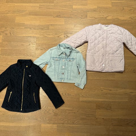 Innholdet 10 bukser, ola jakke, rosa vår jakke, 1 cardigan, 1 beneton jakke, regnbukse, fleece jakke, 3 genser, 3 shorts, 10 t shirts /singlet, 1 Pysj, badetøy, 3 kjoler